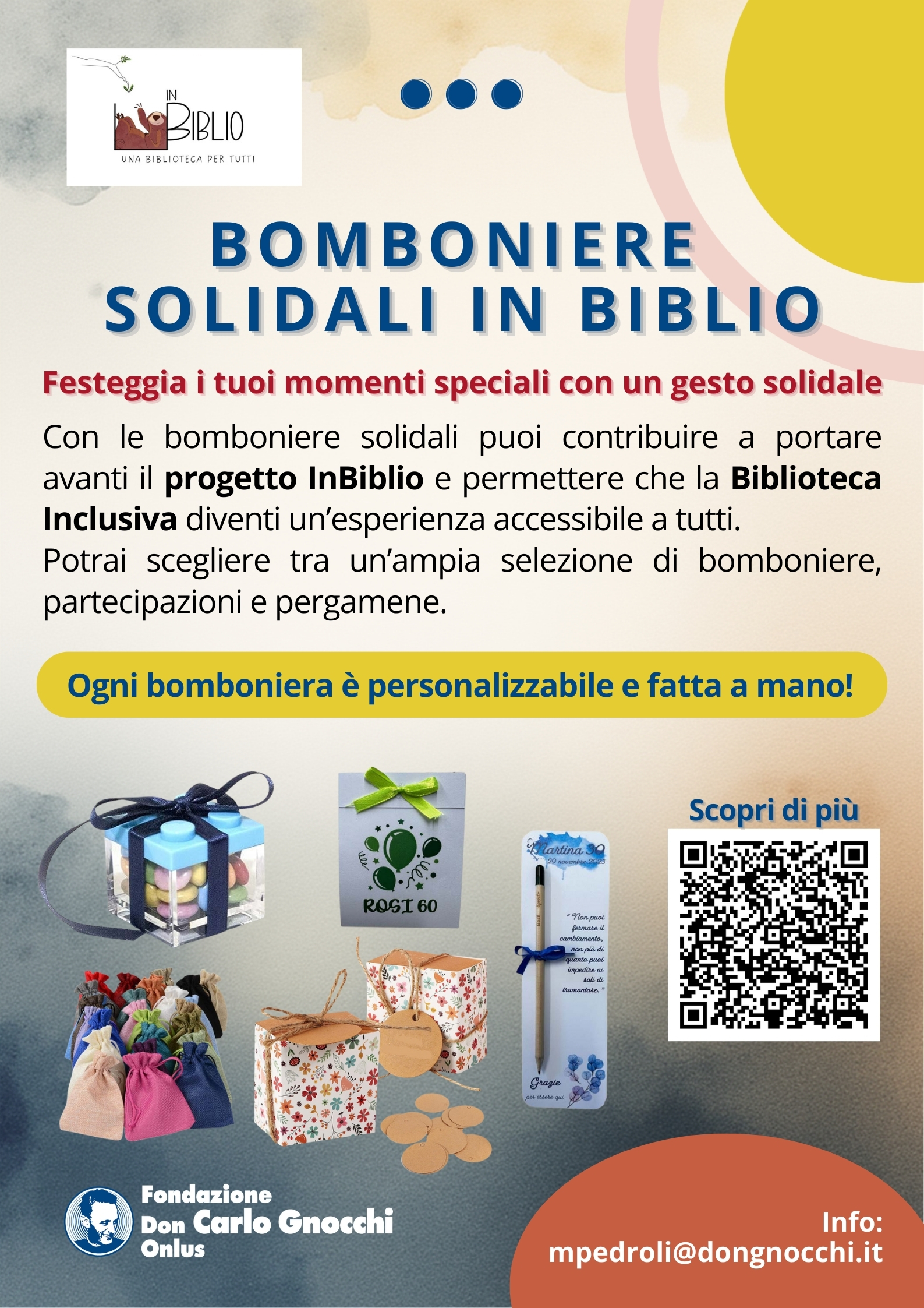 Unendo la tradizione delle bomboniere con un tocco di generosità, queste bomboniere - tutte realizzate a mano - ti permettono di condividere la gioia della tua occasione speciale e, allo stesso tempo, sostenere il nostro progetto "InBiblio" dedicato a bambini con disabilità e permettere che diventi un'esperienza accessibile a tutti.