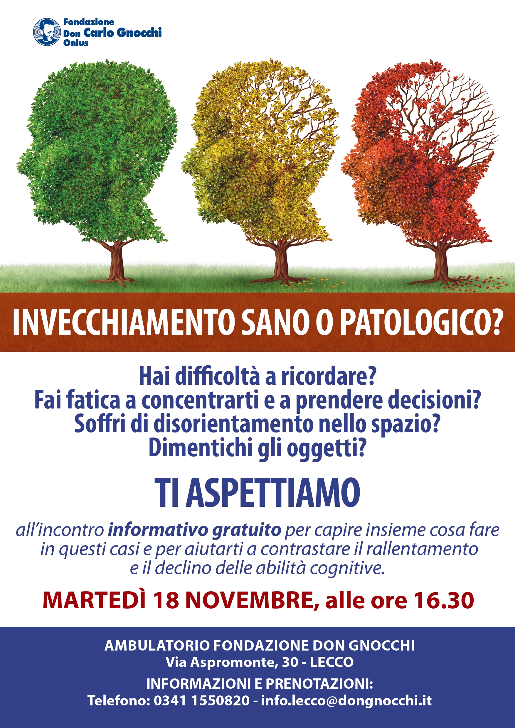 Per comprendere meglio la differenza tra un invecchiamento fisiologico e uno patologico, la Fondazione Don Gnocchi promuove nel pomeriggio di martedì 18 novembre, alle ore 16.30, all’Ambulatorio “Don Gnocchi” di Lecco (via Aspromonte, 30, nella foto) un incontro informativo gratuito aperto a tutti dal titolo: “Invecchiamento sano o patologico?”.