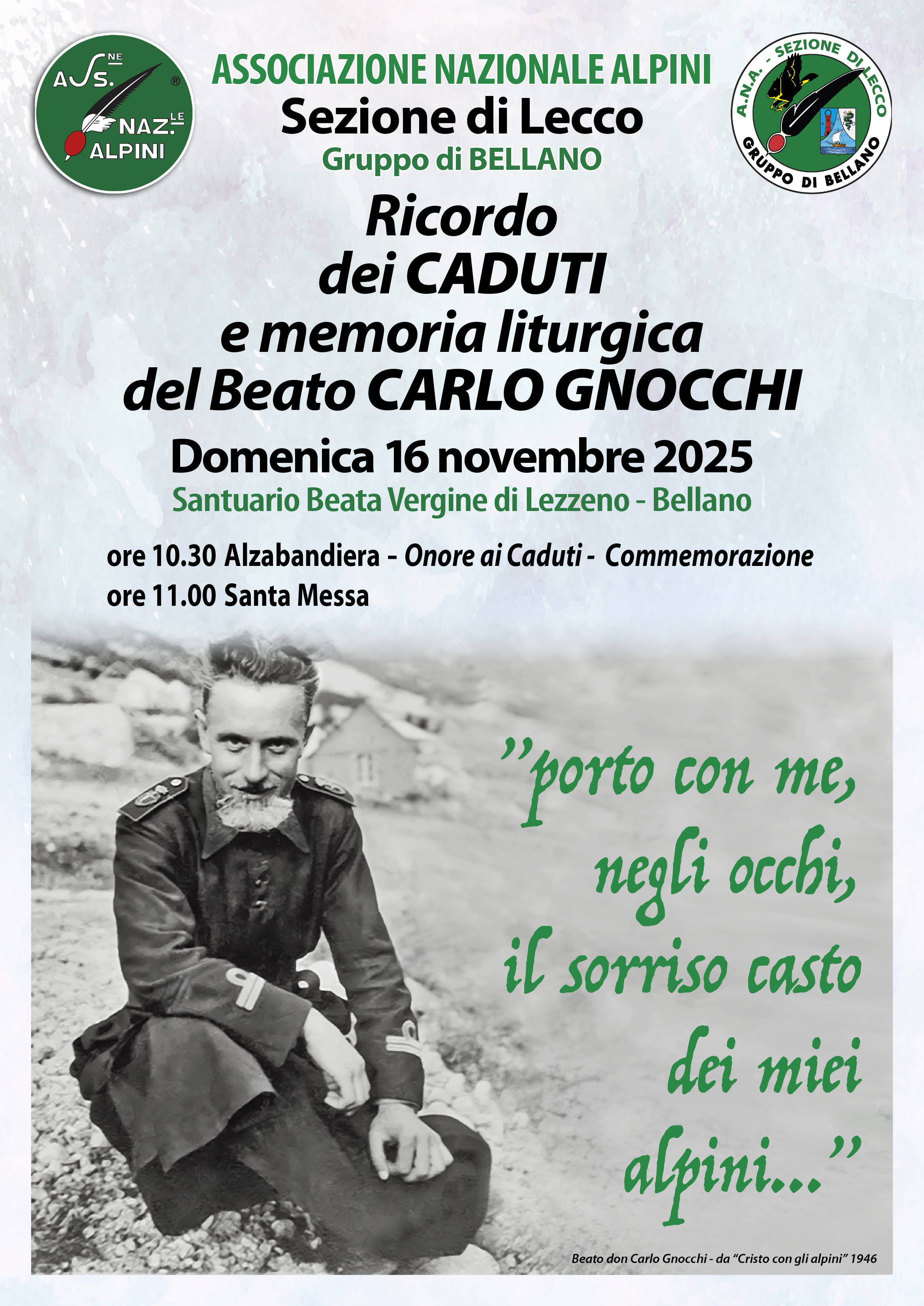 Domenica 16 novembre, dalle ore 10.30, verrà celebrata al santuario Beata Vergine di Lezzeno a Bellano (Lc), la “Festa del ricordo dei Caduti e della memoria del beato don Carlo Gnocchi”.