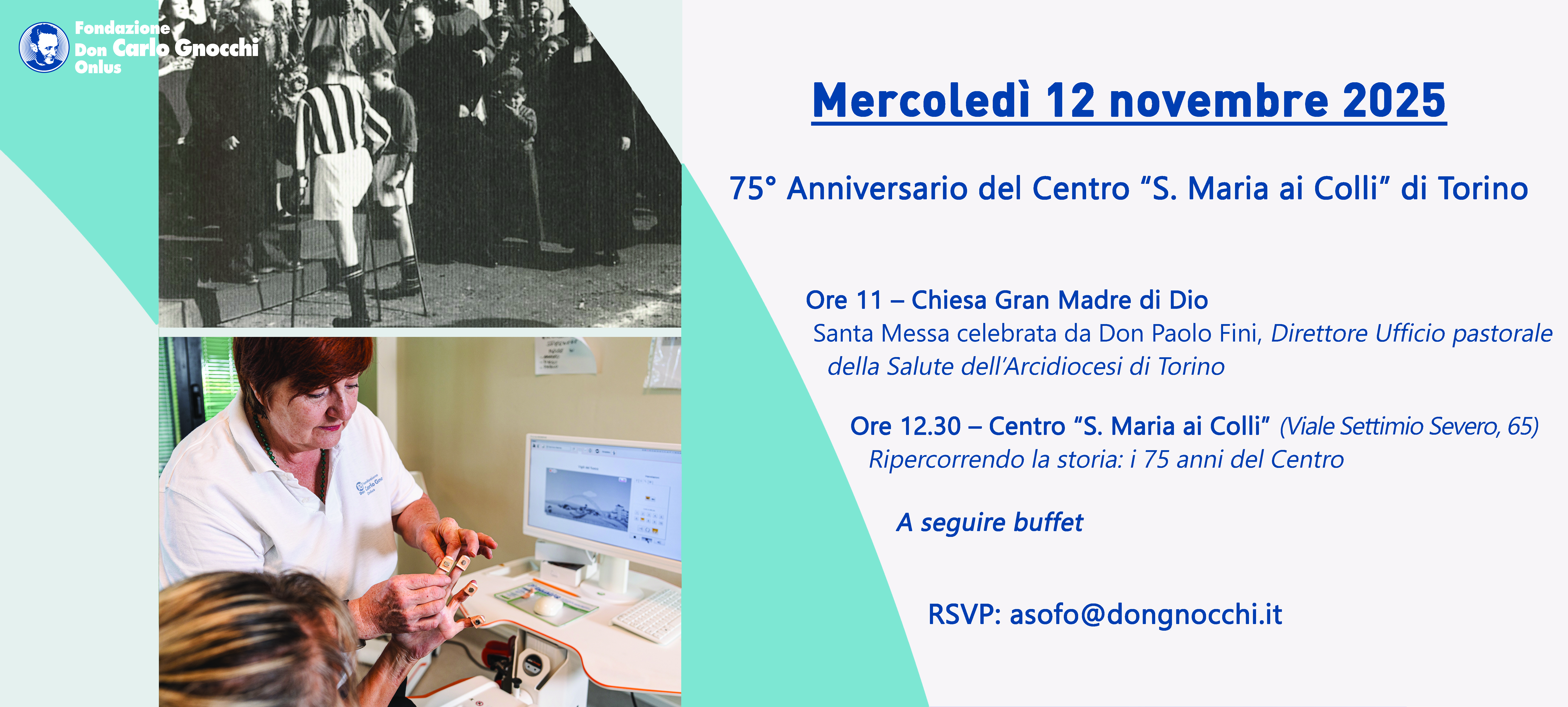 A seguire, alle ore 12.20, nella sede del Centro “S. Maria ai Colli-Presidio sanitario Ausiliatrice” Fondazione Don Gnocchi di Torino (viale Settimio Severo, 65), si terrà un evento conviviale e commemorativo dal titolo “Ripercorrendo la storia: i 75 anni del Centro”, per condividere ricordi, testimonianze e guardare al futuro con rinnovata speranza.